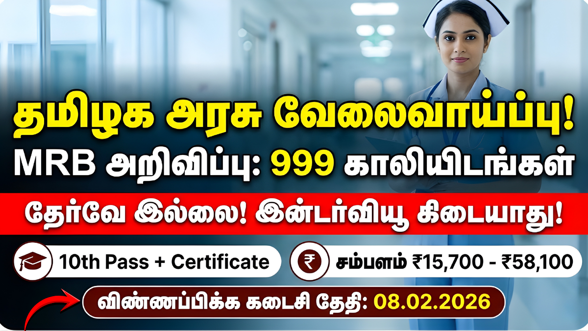 MRB Nursing Assistant Recruitment 2026: தேர்வே இல்லாமல் அரசு வேலை வாங்க வேண்டுமா? அதுவும் மருத்துவத் துறையில்? இதோ தமிழக அரசு வேலை தேடுபவர்களுக்கு ஒரு ஜாக்பாட் அறிவிப்பு! தமிழ்நாடு மருத்துவப் பணியாளர் தேர்வு வாரியம் (MRB) மூலம், மாநிலம் முழுவதும் உள்ள அரசு மருத்துவமனைகளில் காலியாக உள்ள 999 செவிலியர் உதவியாளர் (Nursing Assistant Grade II) பணியிடங்களை நிரப்ப அறிவிப்பு வெளியாகியுள்ளது.