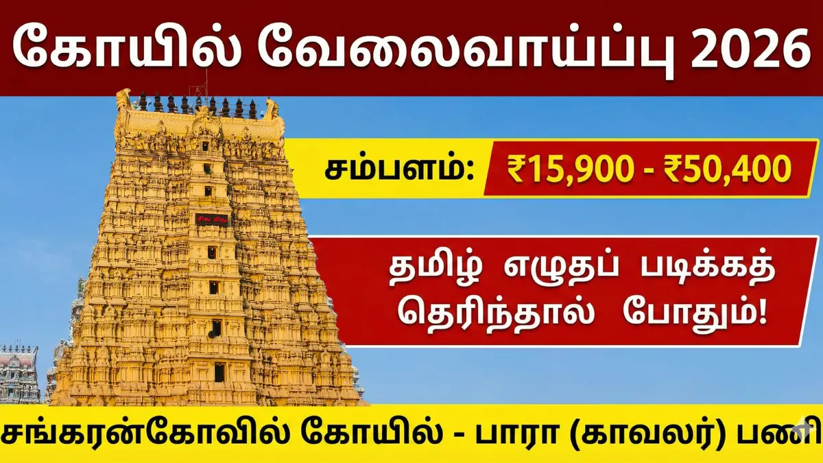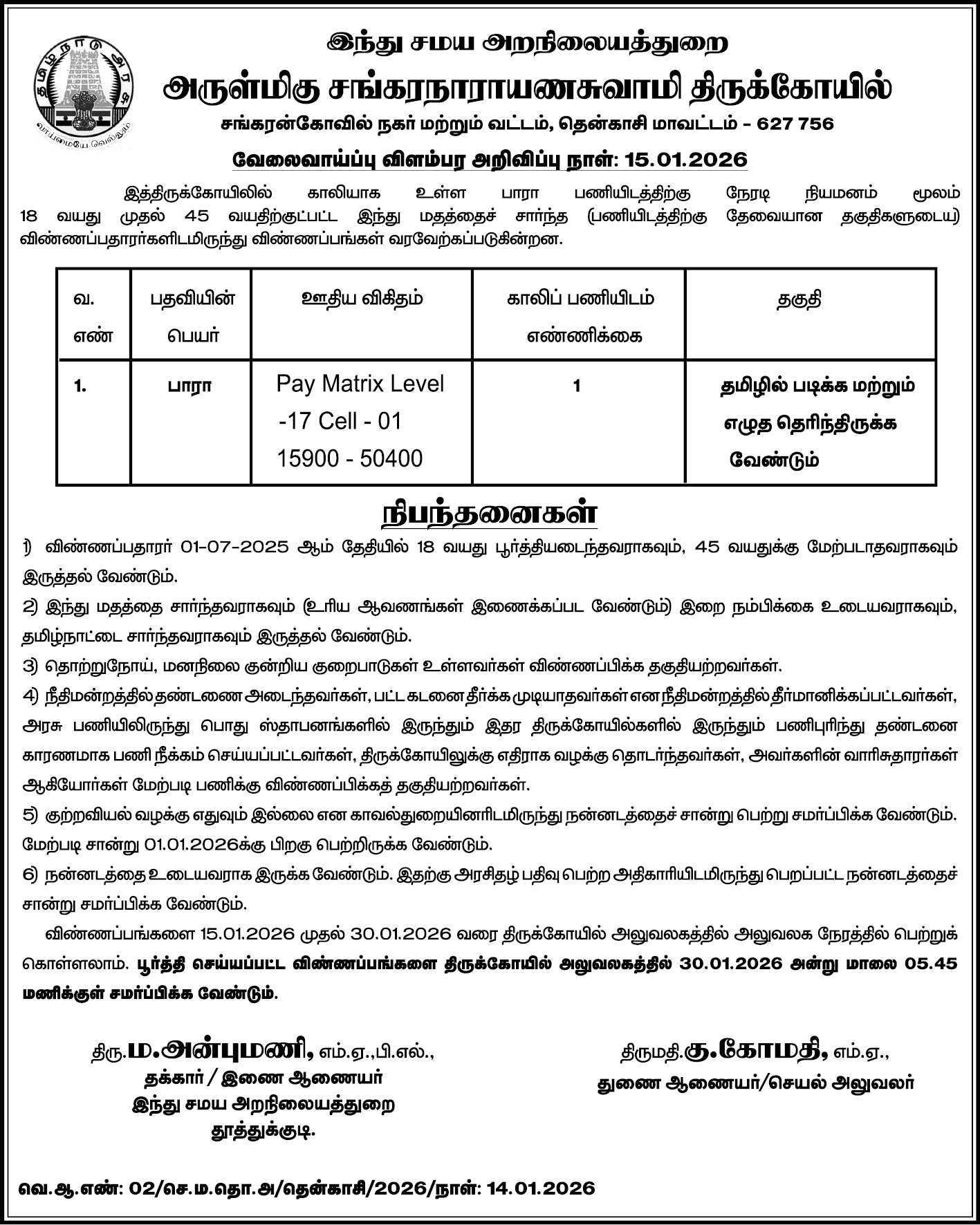 ஆன்மீக ஈடுபாடு கொண்டவர்களுக்கும், அரசாங்க சம்பளத்தில் நிரந்தர வேலை தேடுபவர்களுக்கும் இதோ ஒரு அருமையான வாய்ப்பு! தென்காசி மாவட்டம், சங்கரன்கோவிலில் அமைந்துள்ள அருள்மிகு சங்கரநாராயண சுவாமி திருக்கோயிலில் காலியாக உள்ள பணியிடத்தை நிரப்ப அறிவிப்பு வெளியாகியுள்ளது.